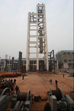 由一處承建的金象18·30合成裝置區合成氨裝置/醇烷化及氨合成工序需就位靜設備31臺,就位體積最大、重量最重、吊裝難度最大的要算氨合成塔這個龐然大物了,氨合成塔自重390噸,高25米,是山西金象煤化工有限責任公司18萬噸合成氨/30萬噸尿素工程(簡稱18·30工程)兩大主體形象工程之一。